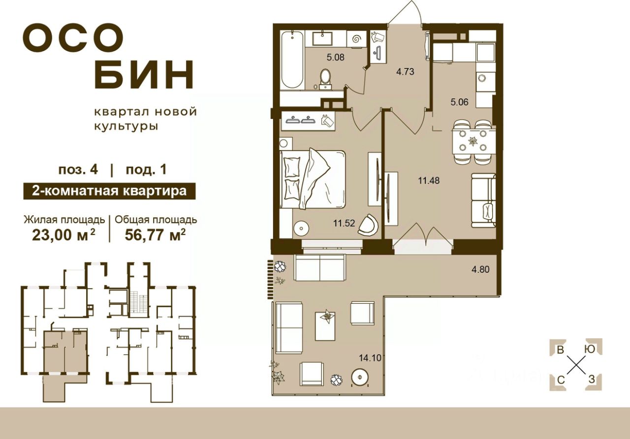 Продаётся 2-комнатная квартира в строящемся доме (Корпус 4), срок сдачи: II-кв. 2026, общей площадью 56.77 кв.м., на 1 этаже.