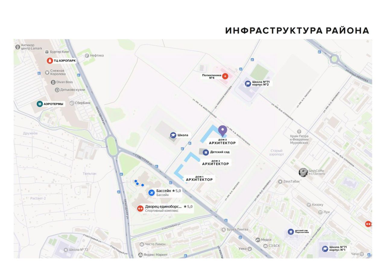 Всего в 7 минутах пешком вы найдете магазины, кафе, аптеки, студии красоты, пункты выдачи маркетплейсов, мед. центр ''Медси'', школа иностранных языков, детские центры развития.ТЦ ''Аэропарк''. Совсем скоро рядом откроют филиал Поликлиники 4 и новую корпус школы 71. А в 70 метрах от дома еще строится новая современная школа, также рядом планируется строительство нового детского сада.