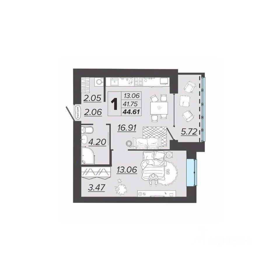 Общая площадь44,61 м2