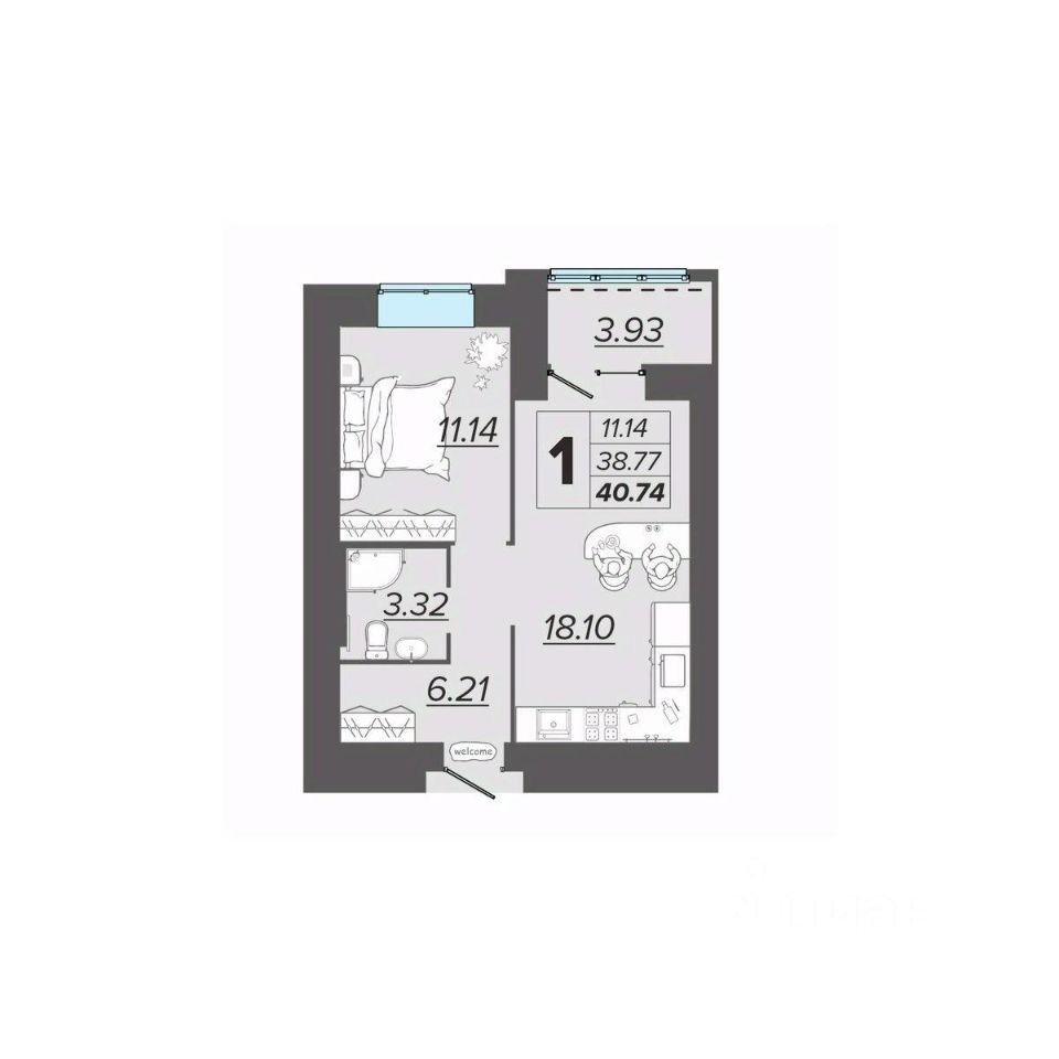 Общая площадь40,74 м2