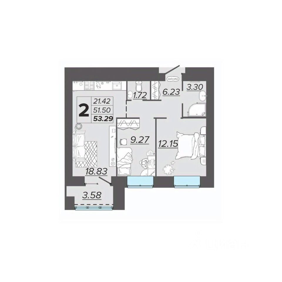 Общая площадь53,29 м2