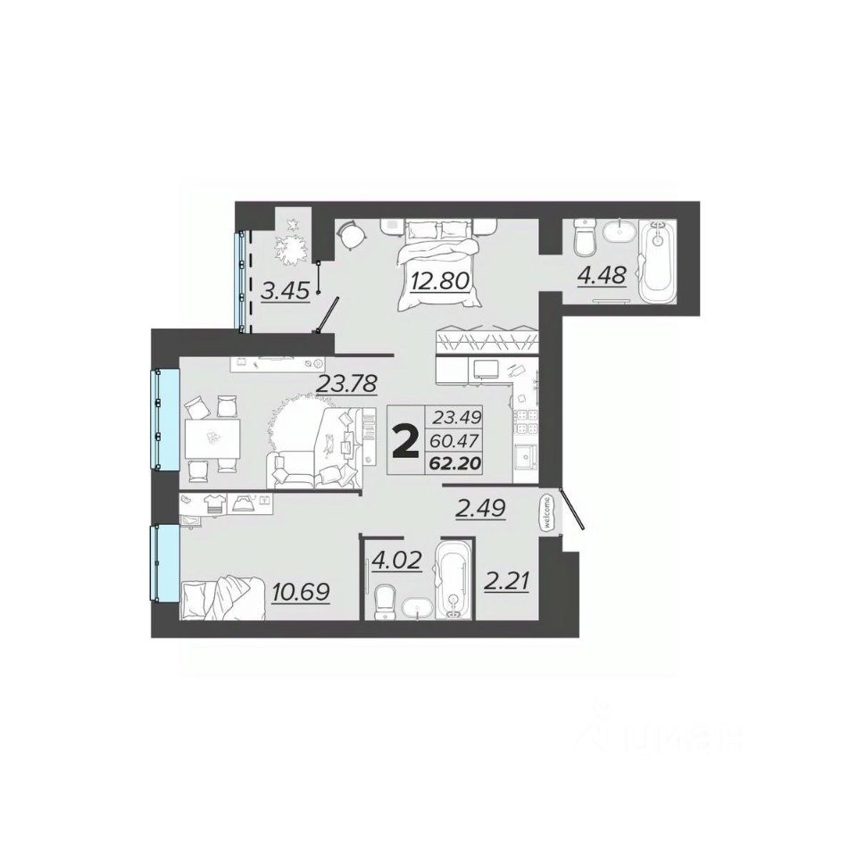 Общая площадь62,2 м2