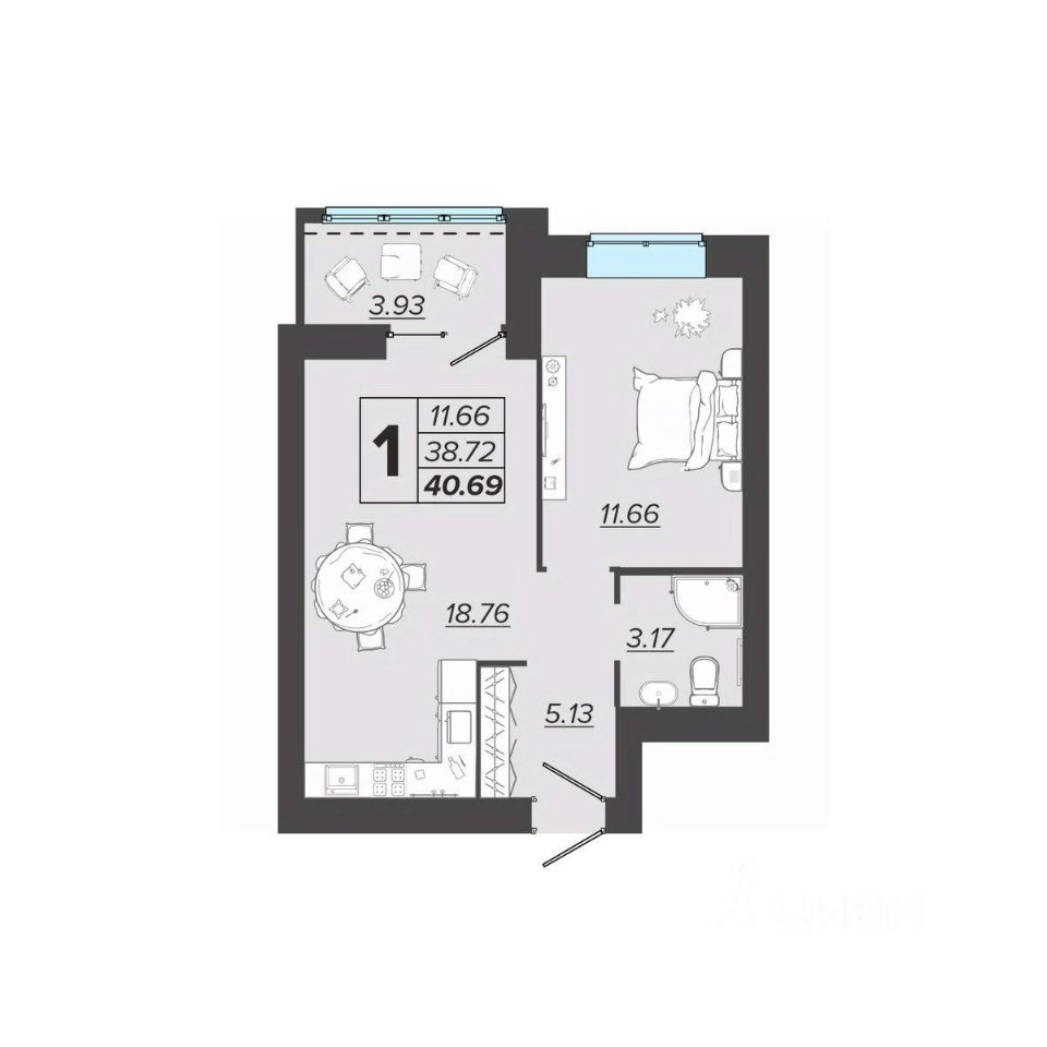 Общая площадь40,69 м2