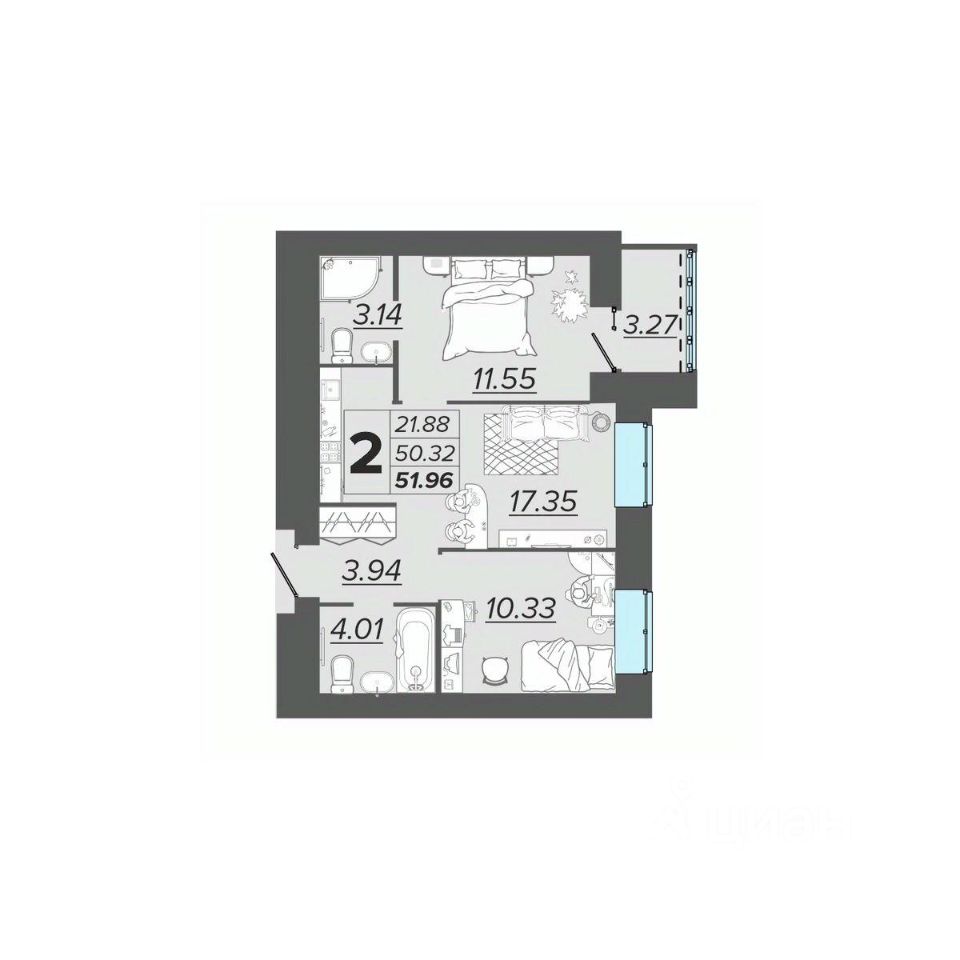 Общая площадь51,96 м2