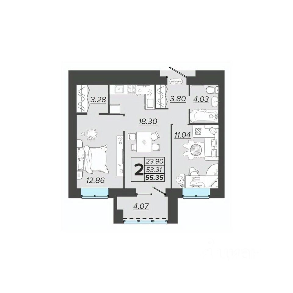 Общая площадь55,35 м2