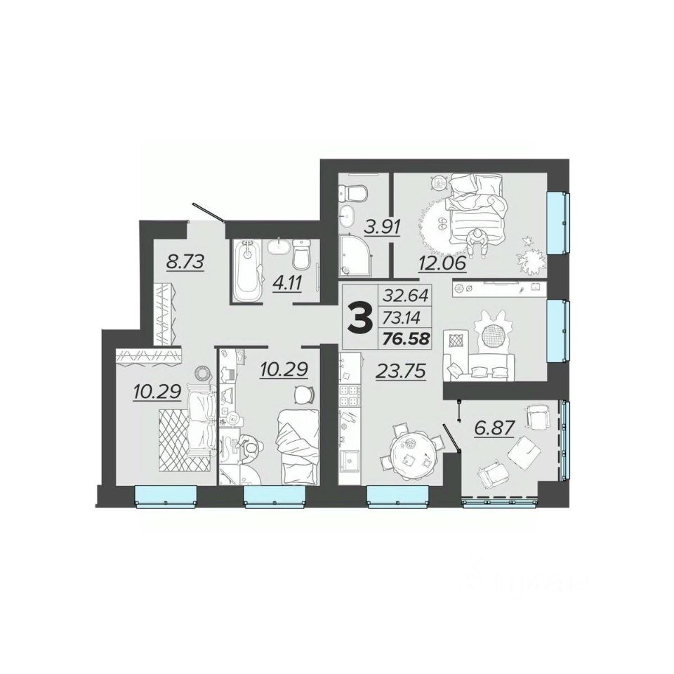 Общая площадь76,58 м2