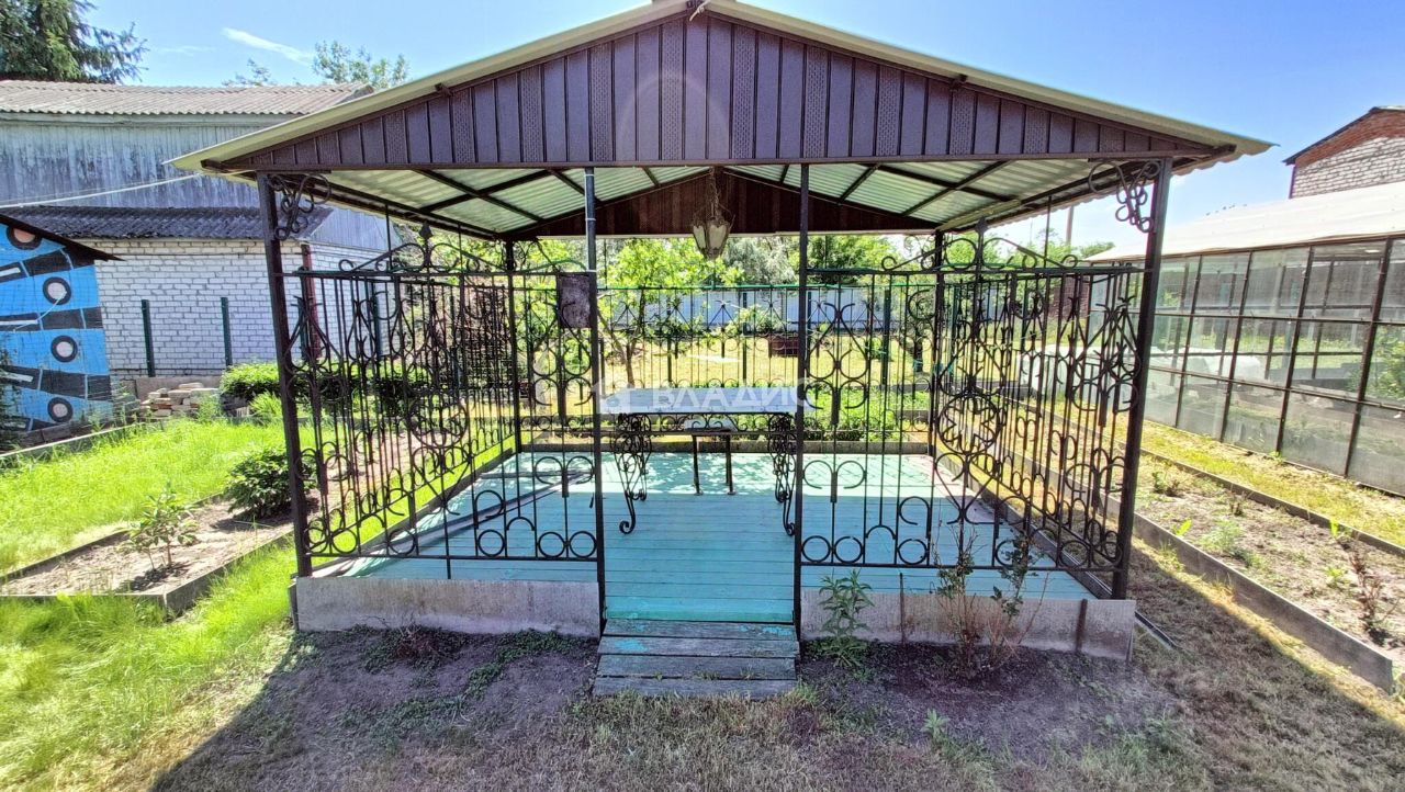 В центре участка установлена прекрасная просторная металлическая беседка (с ограждением и полом) с хорошим столом на кованом металлическом основании.