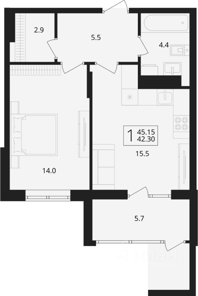 Общая площадь45,15 м2