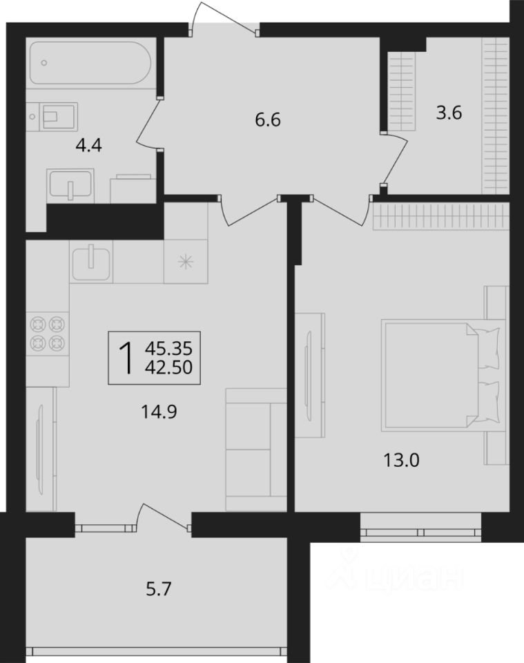 Общая площадь45,35 м2