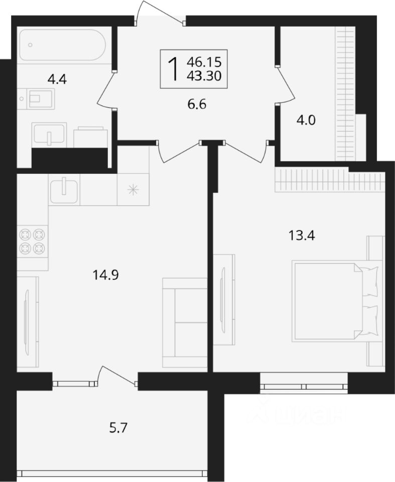 Общая площадь46,15 м2