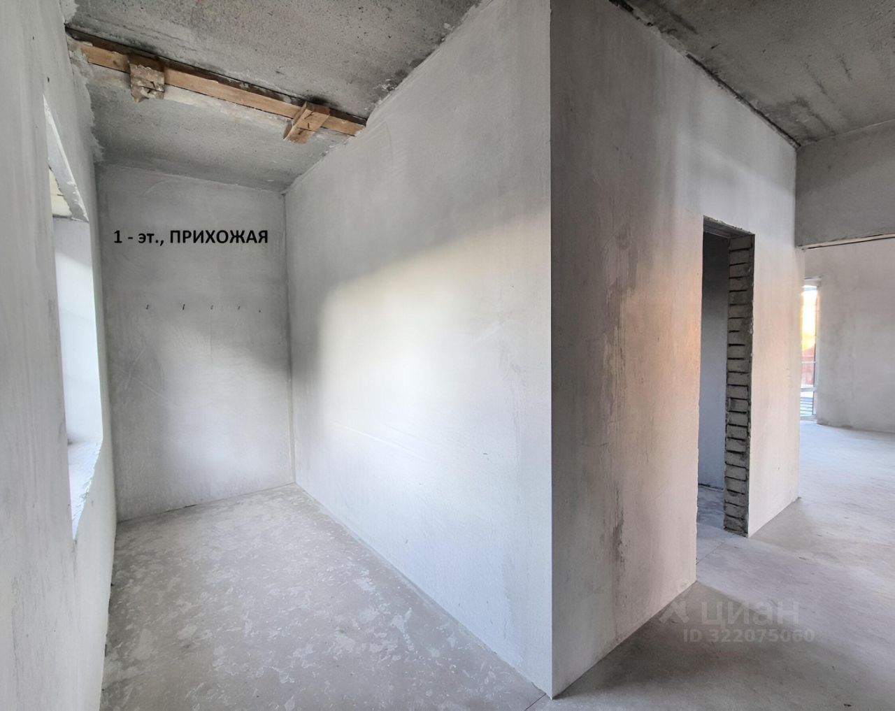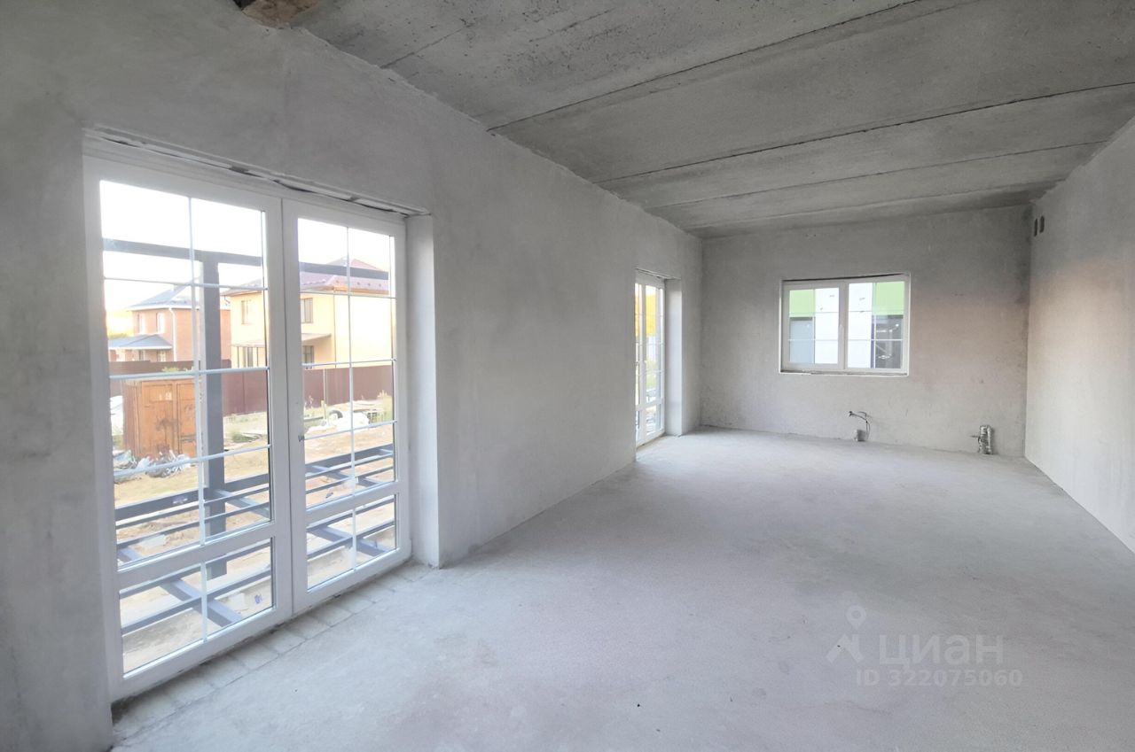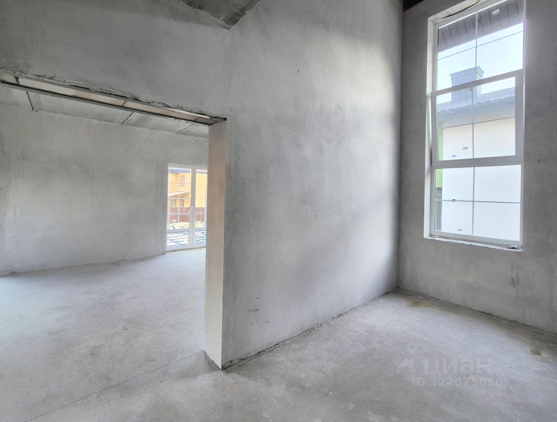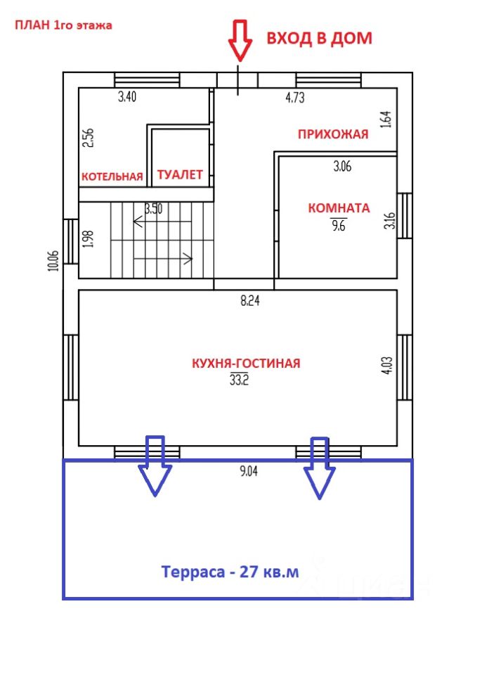 На 1 этаже расположены: - кухня-гостиная 33 км.м. с выходом на большую террасу 27 кв.м. (два выхода двери полностью открываются нет перемычки в проемах), - жилая комната, - просторная прихожая, - пространство для 2х маршевой лестницы на 2-й этаж освещено естестественным светом через большое окно высотой на 2 этажа, - котельная и туалет.