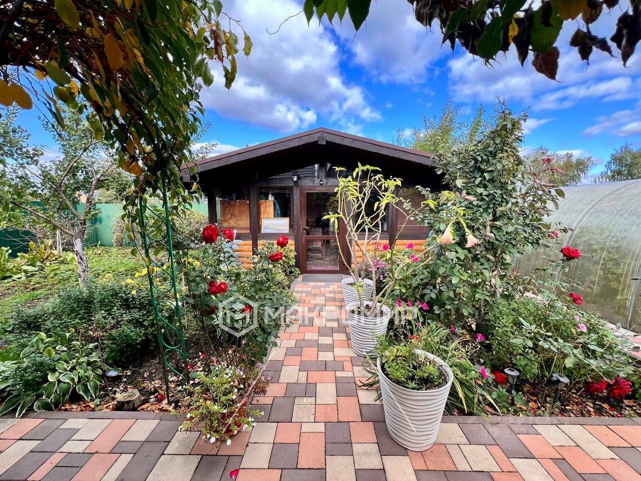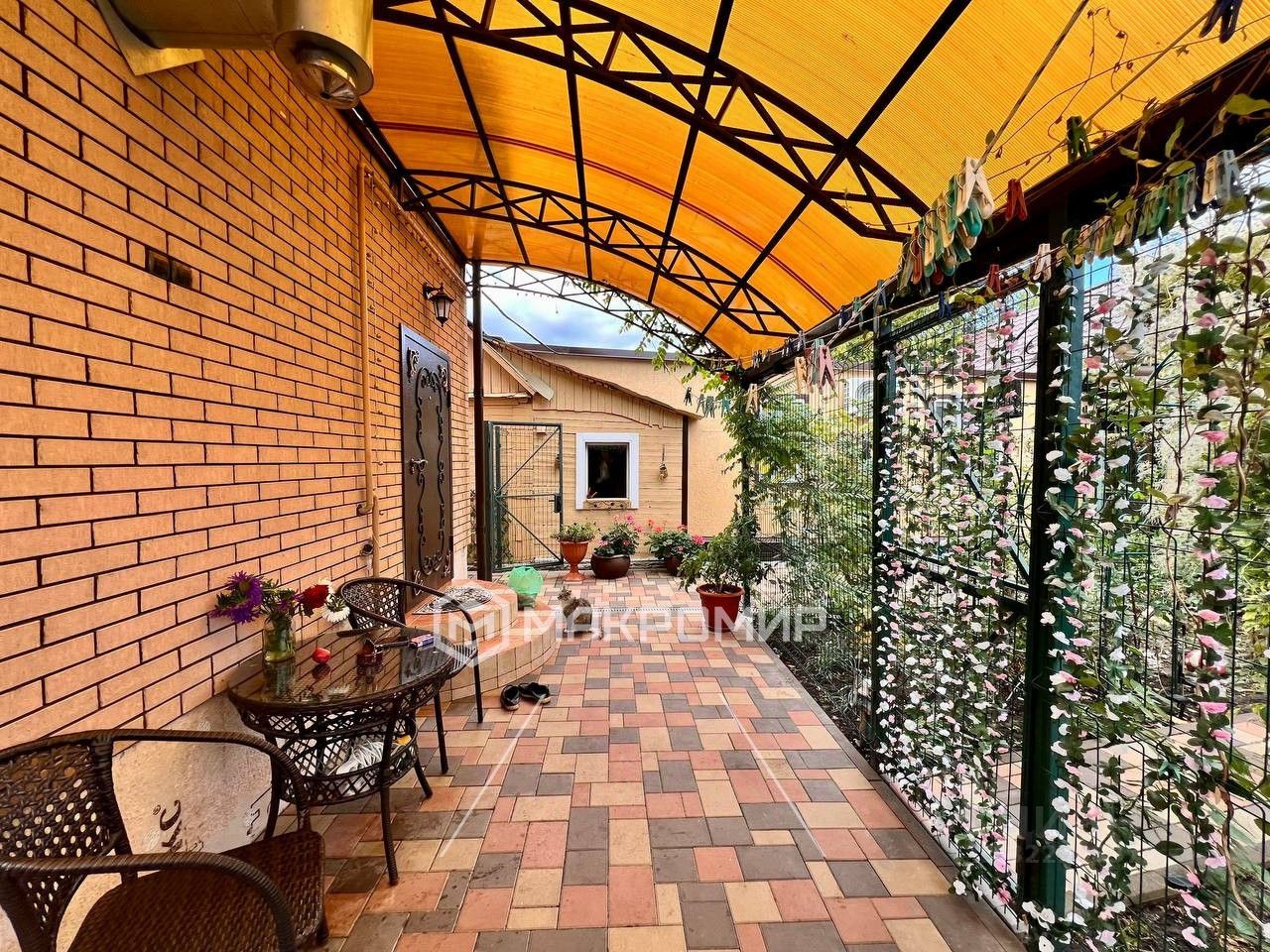 Внешняя отделка дома: облицовочный кирпич, крыша металлочерепица. Двор выложен тротуарной плиткой, посажены розы, туи, фруктовые деревья. На участке беседка с панорамными окнами, печью для приготовления, большим столом, кондиционером.