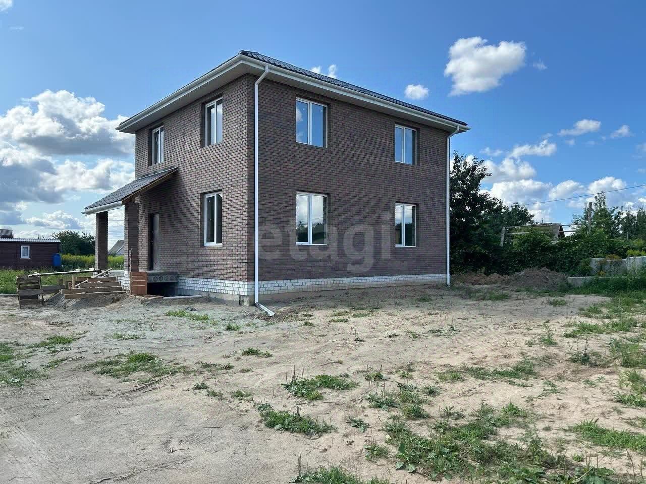 Готовая коробка дома с наружной отделкой. Лестница между 1-м и 2-м этажом. Крыльцо с входом на 3 стороны. Крыша над крыльцом с софитом и водосточной системой. Обустроенный вход в подвал. Подготовленный пол в подвале под заливку стяжки.