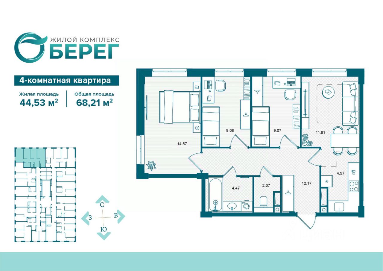Продаётся 4-комнатная квартира в строящемся доме (поз.2), срок сдачи: IV-кв. 2027, общей площадью 68.21 кв.м., на 16 этаже. Современный жилой комплекс ЖК ''О' Берег'' на ул. Флотской, воплощает идею комфортной, доступной и продуманной городской среды. Комплекс расположен вблизи набережной, в экологически благоприятной зоне города. Панорамный вид на воду и зелёные аллеи усиливают ощущение уюта и создают атмосферу природной гармонии прямо в черте города.