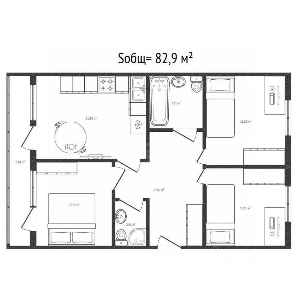 Продается трехкомнатная квартира 82,9 кв.м. в ЖК ''Резиденция ГринПарк'' жилом комплексе нового поколения. Это полноценная среда для жизни с ландшафтным парком и зеленой благоустроенной центральной площадью для прогулок. Жить в ''Резиденции ГринПарк'' - это значит быть в центре жизни нашего удивительного города и иметь потрясающую возможность за считанные минуты оказаться в тишине и красоте. Описание квартиры - не угловая - распашонка - чистовая отделка (стяжка, штукатурка, остекленные окна, балконы, входная металлическая дверь и радиаторы отопления) - кухни-гостиная - высота потолков - 2,75 м - панорамное остекление лоджии - терраса на первом этаже - счетчики: вода, тепло, электричество - телефонизация, кабельное телевидение, интернет