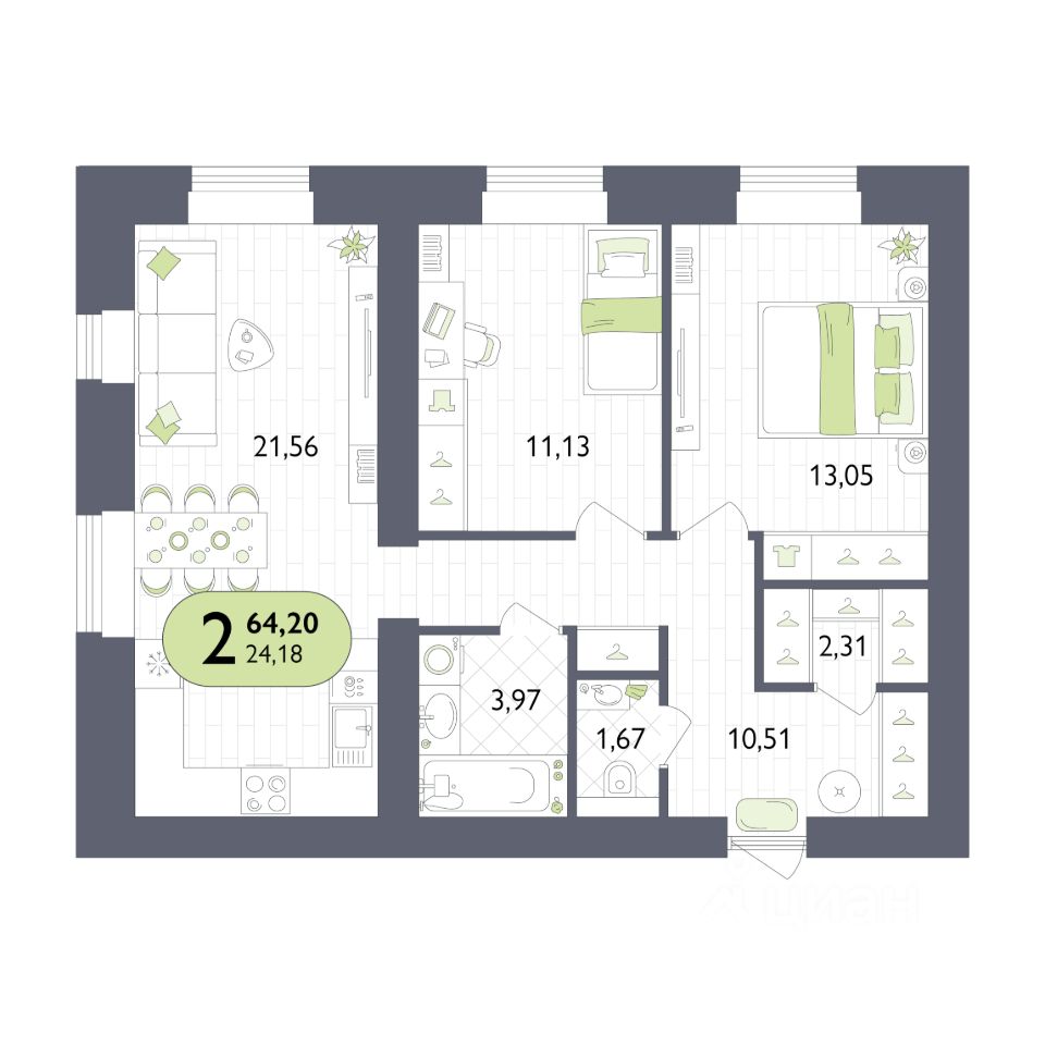 Общая площадь64,2 м2