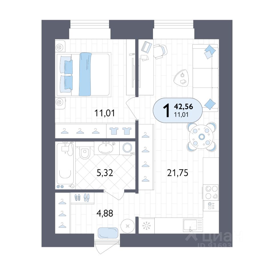 Общая площадь42,56 м2