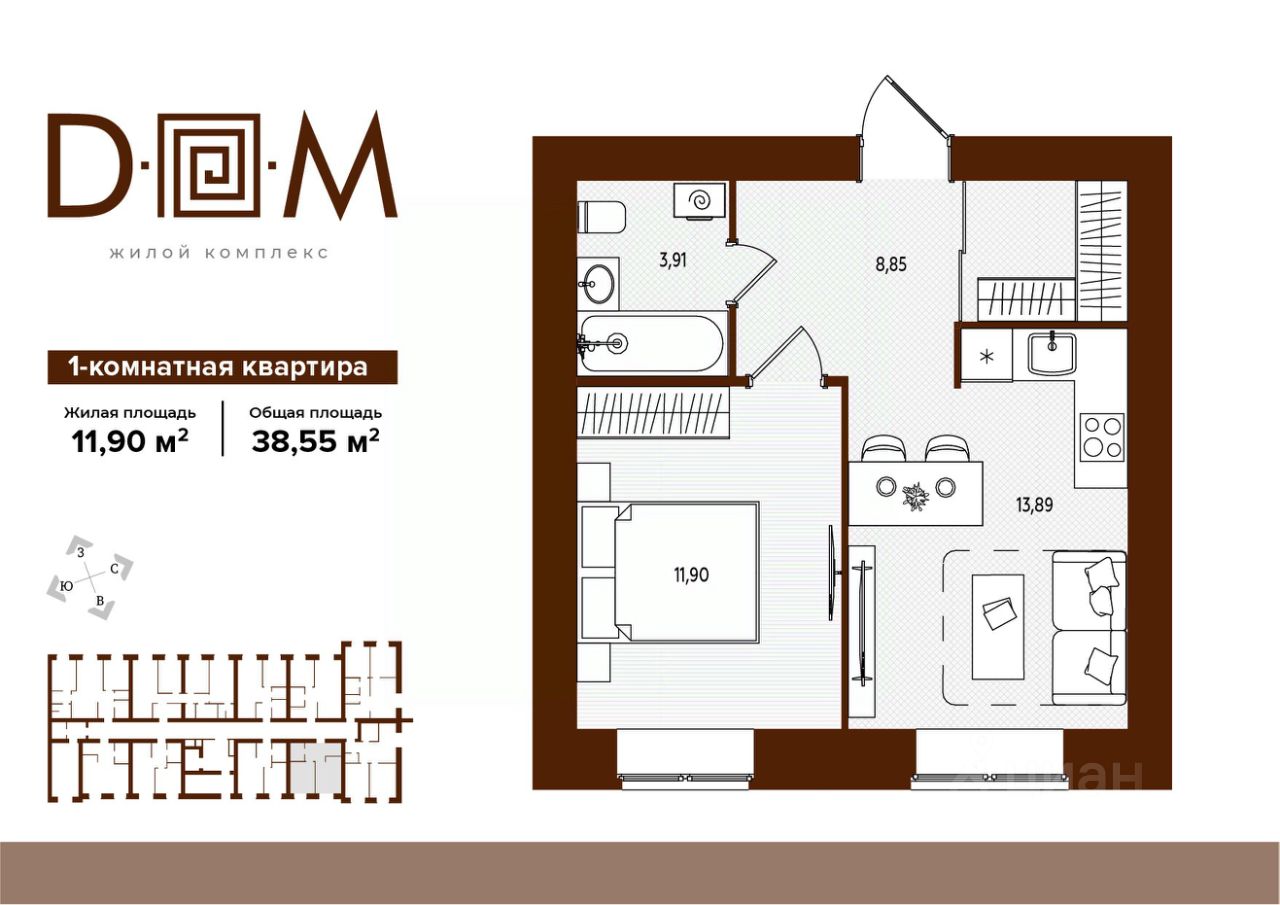 Продаётся 1-комнатная квартира в строящемся доме (поз.1), срок сдачи: IV-кв. 2027, общей площадью 38.55 кв.м., на 5 этаже. Новый жилой комплекс ''Д.О.М.'' от застройщика ''Надежда'' расположен по адресу: г. Брянск, ул. Романа Брянского