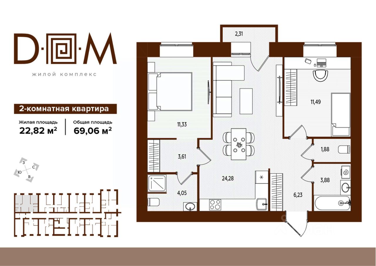 Продаётся 2-комнатная квартира в строящемся доме (поз.1), срок сдачи: IV-кв. 2027, общей площадью 69.06 кв.м., на 3 этаже. Новый жилой комплекс ''Д.О.М.'' от застройщика ''Надежда'' расположен по адресу: г. Брянск, ул. Романа Брянского