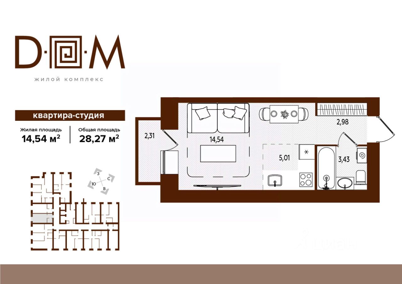Продаётся студия в строящемся доме (поз.1), срок сдачи: IV-кв. 2027, общей площадью 28.27 кв.м., на 6 этаже. Новый жилой комплекс ''Д.О.М.'' от застройщика ''Надежда'' расположен по адресу: г. Брянск, ул. Романа Брянского