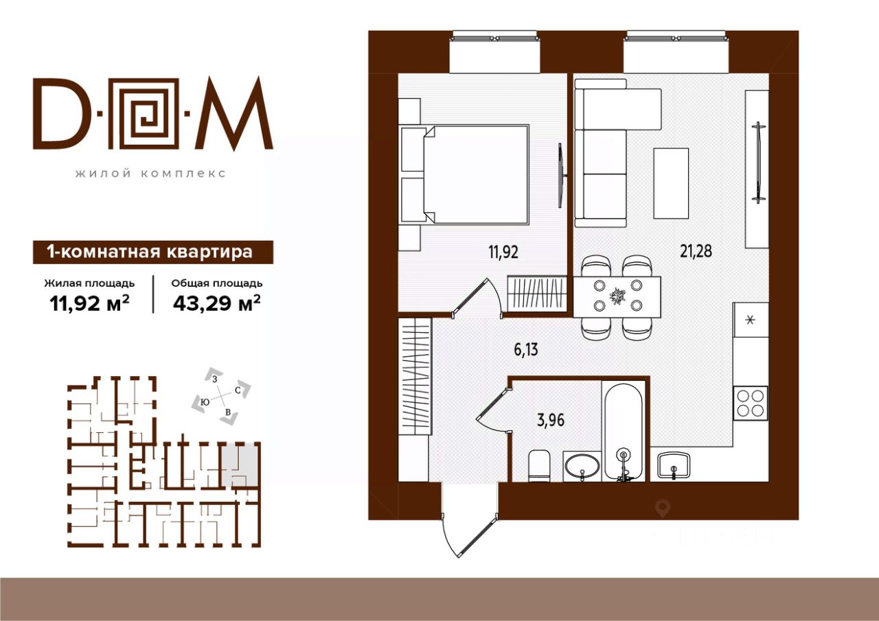 Продаётся 1-комнатная квартира в строящемся доме (поз.1), срок сдачи: IV-кв. 2027, общей площадью 43.29 кв.м., на 7 этаже. Новый жилой комплекс ''Д.О.М.'' от застройщика ''Надежда'' расположен по адресу: г. Брянск, ул. Романа Брянского