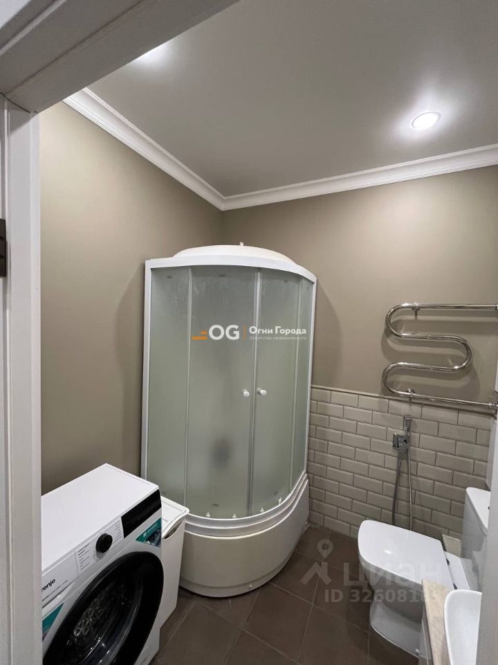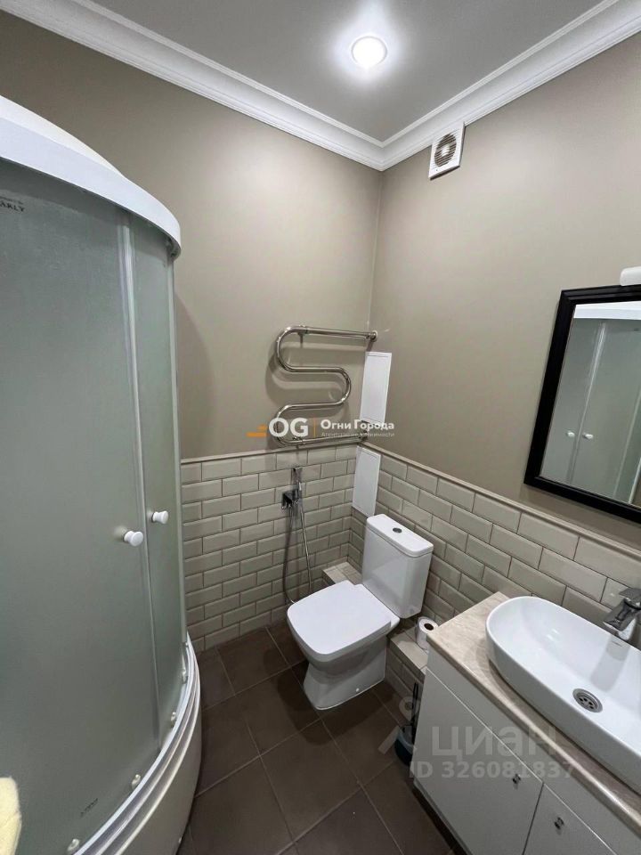 Санузел совмещенный, облицован современной плиткой, установлена душевая кабина.