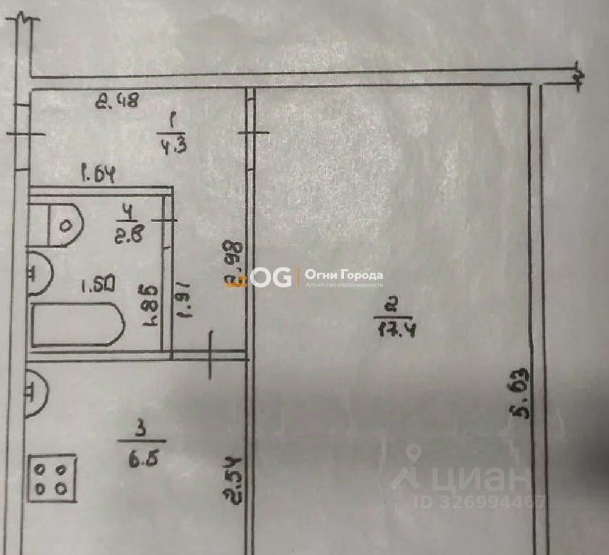 Общая площадь квартиры составляет 32.3 кв.м., из которых жилая 17.4 кв.м., а функциональная кухня 6.5 кв.м. Высота потолков 2.5 метра.