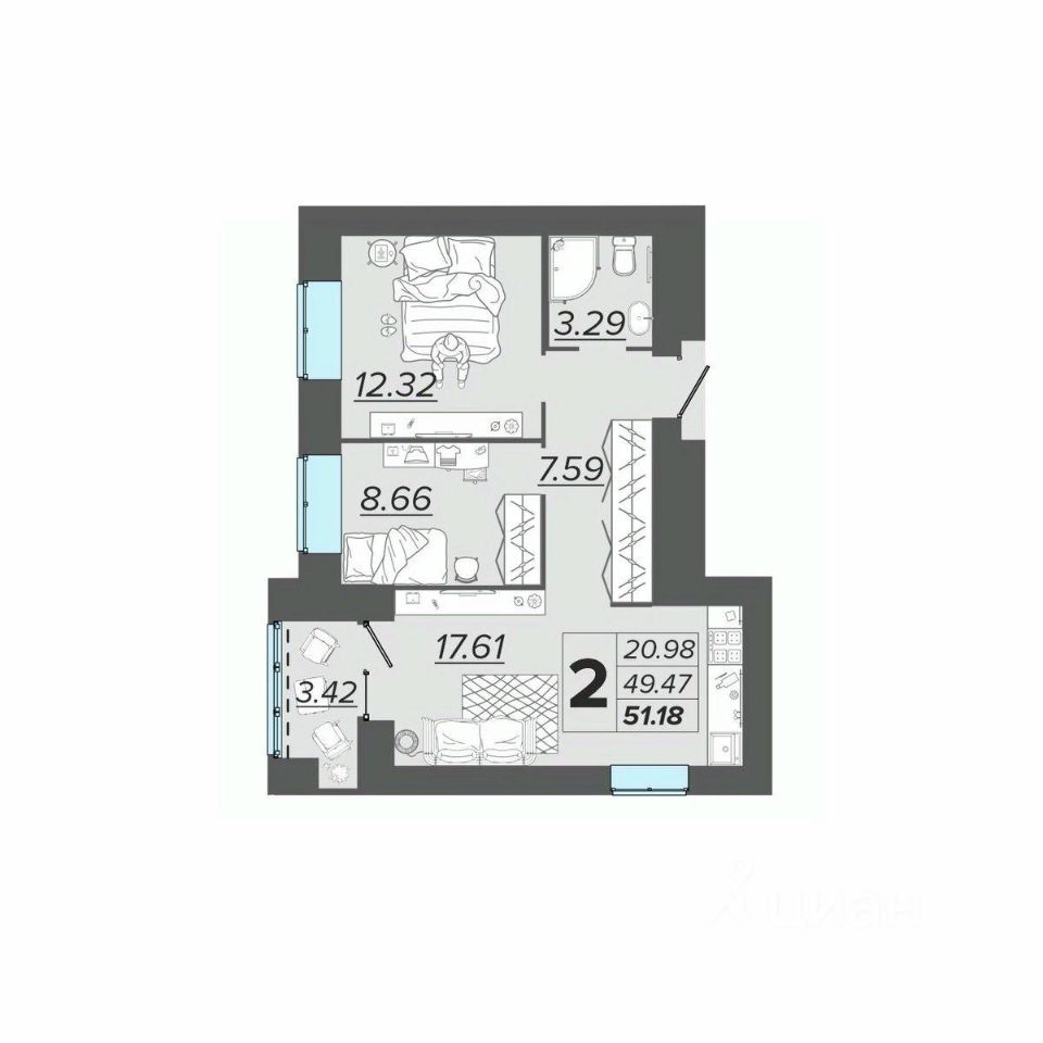 Общая площадь51,18 м2