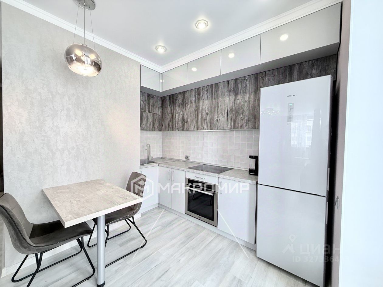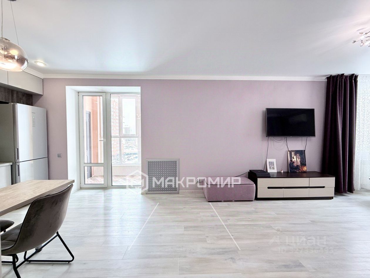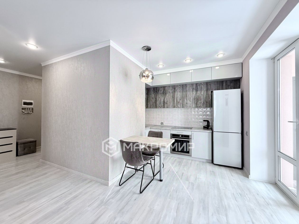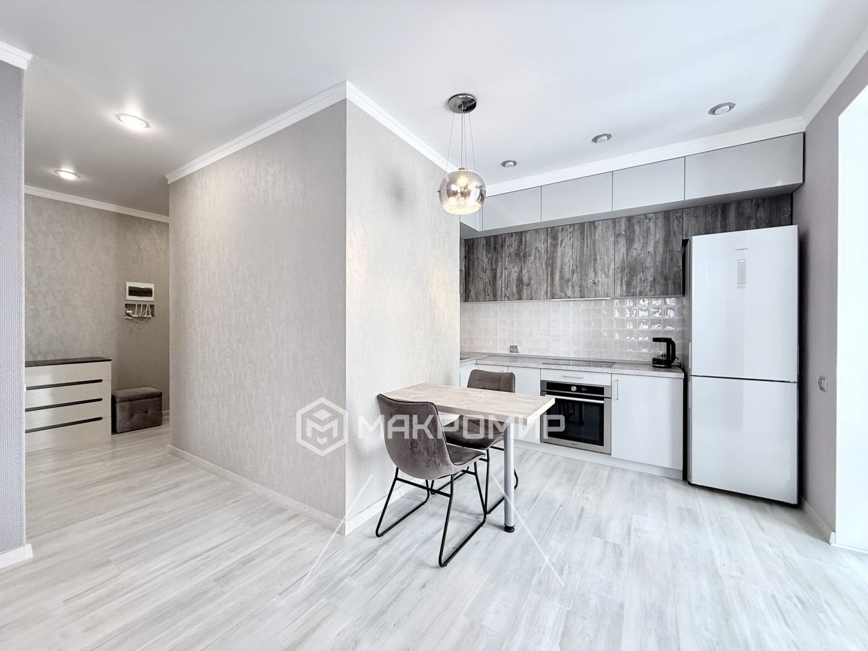За счёт объединения кухни и комнаты, в квартире кухня-гостиная площадью 27,4 м2. В кухонной зоне установлен качественный кухонный гарнитур с встроенной электрической поверхностью, духовым шкафом, холодильником. В зоне гостиной просторное и светлое пространство, где вы будете с удовольствием отдыхать с семьей и гостями.