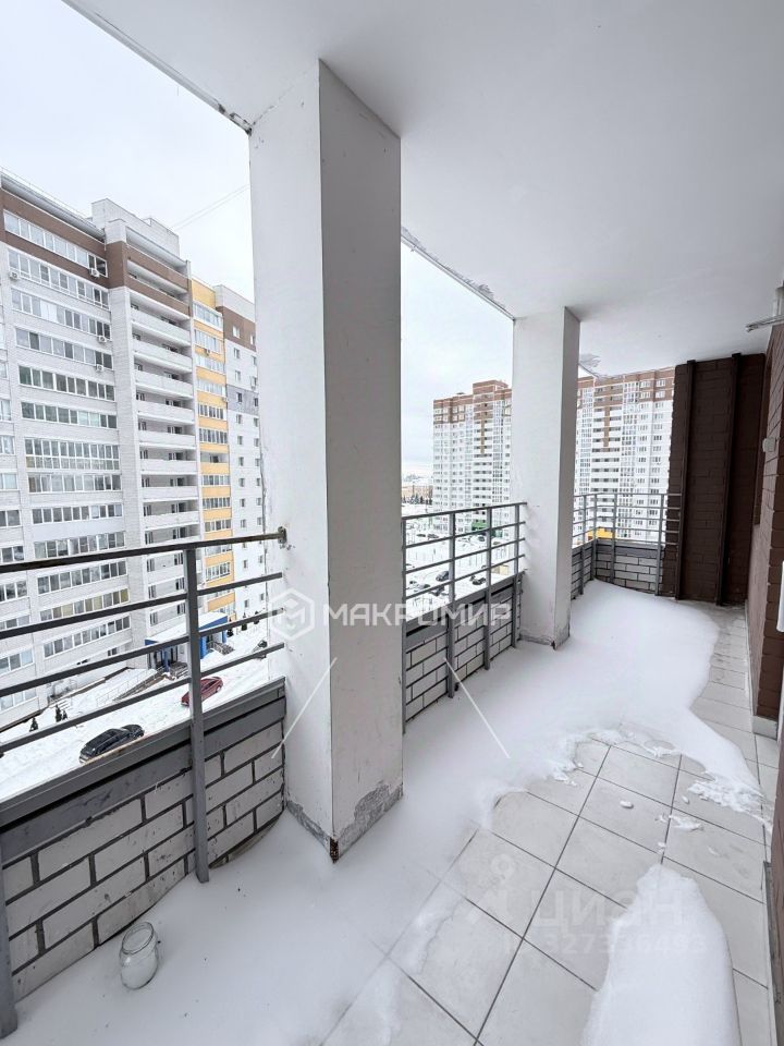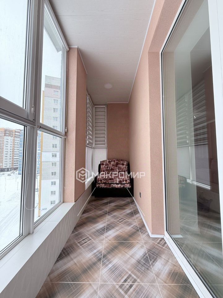 Просторная лоджия с панорамным остеклением. На остеклении установлены жалюзи. На лоджии организована кладовая. Высокий этаж, что открывает приятный вид на город и обеспечивает дополнительное естественное освещение квартиры.